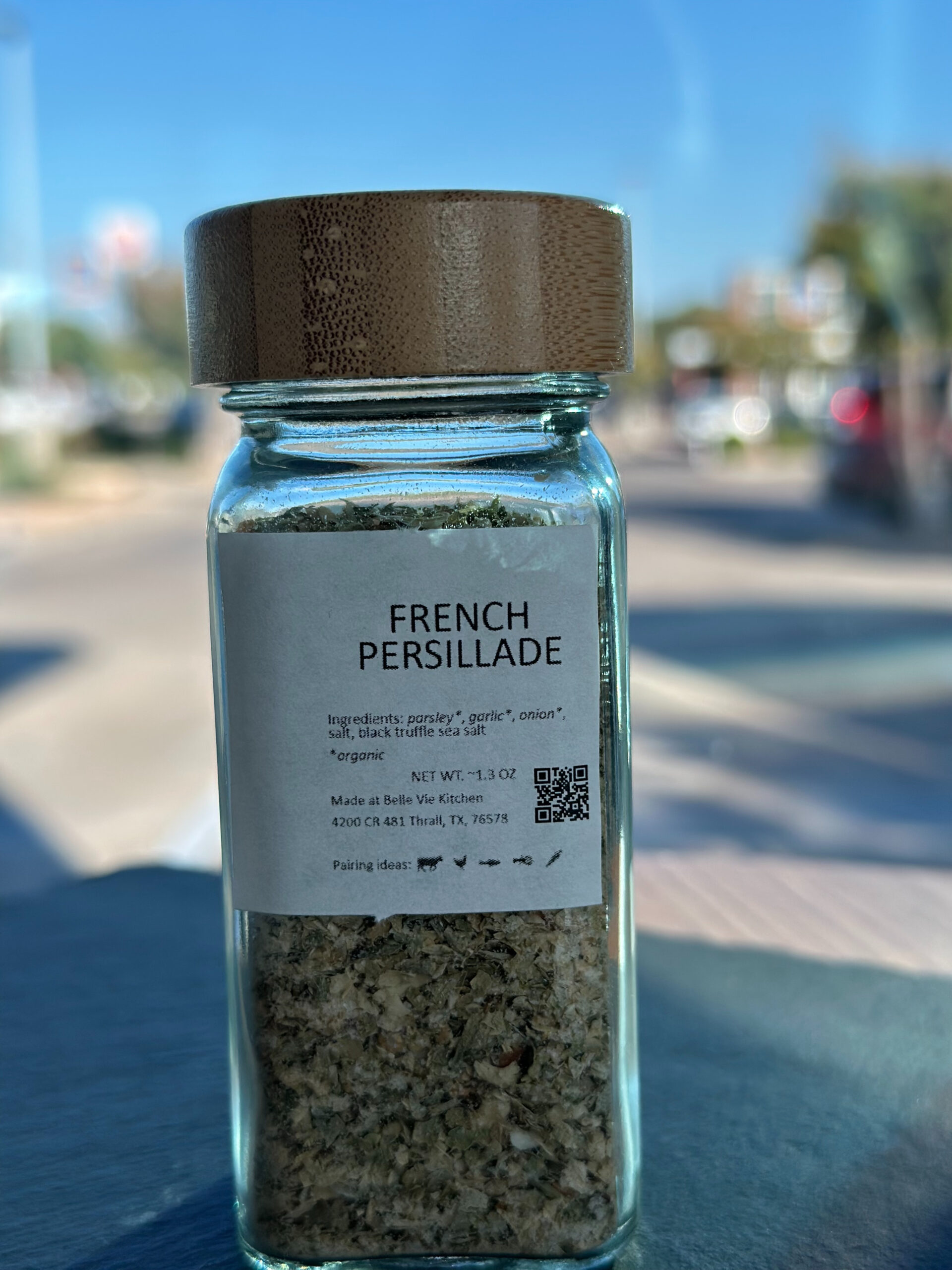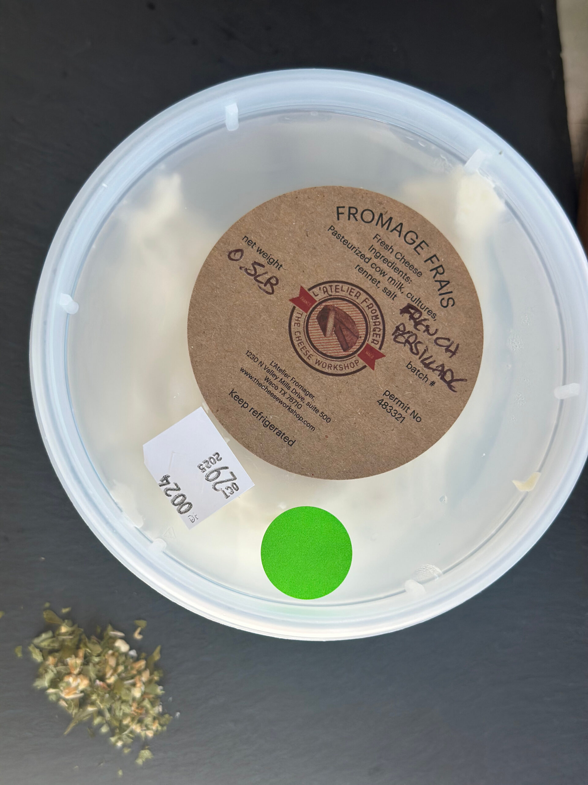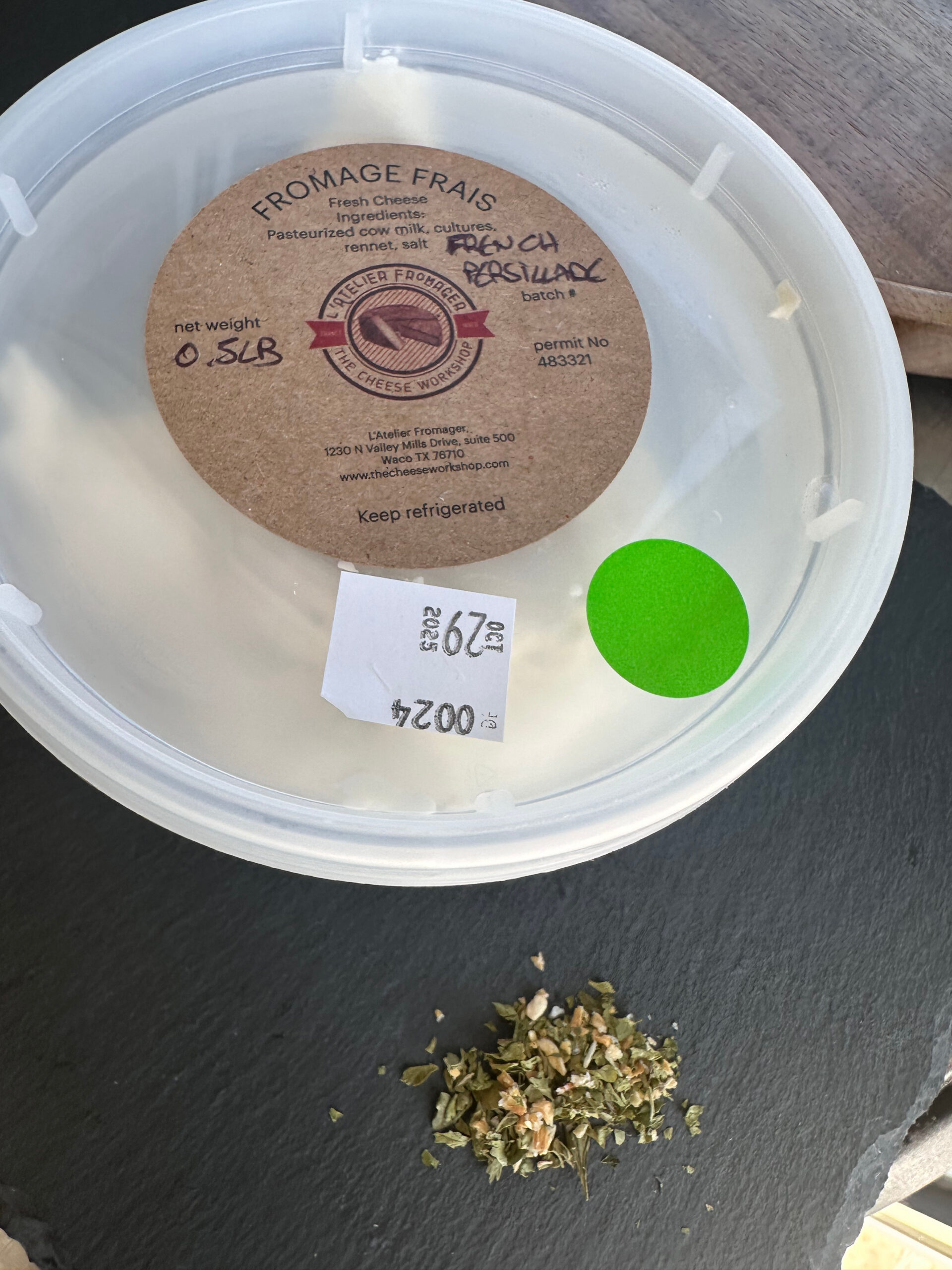 This Fromage Frais (fresh cheese), is flavored with an herb mix made by The French Longhorn. Persil is the French word for parsley. The mix contains parsley, garlic, onion, salt and black truffle sea salt.